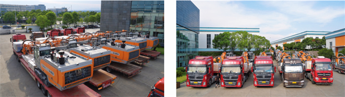 炎炎夏日中,陽(yáng)光明媚,為這繁忙的工業(yè)景象增添了幾分生機(jī)與活力。一排排整齊劃一的平板卡車巍然矗立整裝待發(fā),它們不僅是運(yùn)輸工具,更是志高機(jī)械精湛工藝與卓越品質(zhì)的流動(dòng)展示平臺(tái)。每輛卡車上,滿載的橙色與灰色相間的醒目配色與機(jī)械臂交相輝映,這些正是志高機(jī)械引以為傲的一體式露天潛孔鉆機(jī)。鉆機(jī)在陽(yáng)光下熠熠生輝,預(yù)示著它們即將在各大工地上大展拳腳,助力礦山產(chǎn)能再上新臺(tái)階。