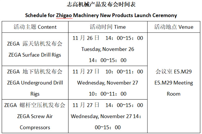 26號和27號,志高將在E5.M29會議室舉辦3場產品發(fā)布會,詳細介紹公司的露天鉆機、地下鉆機以及空壓機產品。在被展廳里的龐大機械吸引目光的同時,您還可以來會議室參加它的發(fā)布會,詳細了解它龐大身軀下的出色能力。帶有自動集中潤滑系統(tǒng)的ZEGA D490A、反循環(huán)勘探鉆機ZEGA D480RC、露天一體式牙輪鉆機ZEGA R8100……聽聽產品的性能和配置介紹,或許它比外型更能打動你。 - 2024年11月26日至29日,我們在上海新國際博覽中心E5.511展位等你!