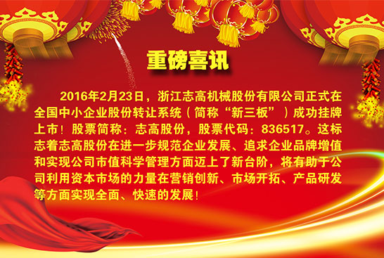重磅喜訊:浙江志高機(jī)械股份有限公司成功掛牌“新三板”[2016-02-28]2016年2月23日,浙江志高機(jī)械股份股份有限公司正式在全國中小企業(yè)股份轉(zhuǎn)讓系統(tǒng)(簡稱“新三板”)成功掛牌上市!股票簡稱:志高股份,股票代碼:836517。這標(biāo)志著志高股份在進(jìn)一步規(guī)范企業(yè)發(fā)展、追求企業(yè)品牌增值和實現(xiàn)公司市值科學(xué)管理方面邁上了新臺階,將有助于公司利... 閱讀全文