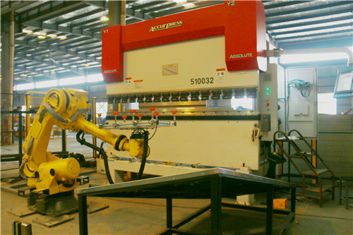 廠區(qū)內(nèi)的鈑金車間是志高機械空壓機、鉆機產(chǎn)品外罩殼的主要生產(chǎn)車間,為滿足市場需求,車間內(nèi)每天的外罩殼產(chǎn)量需保持在一百套以上,生產(chǎn)壓力比較大。傳統(tǒng)的鈑金車間每臺折彎機需配備一到兩名的操作手,工人需要搬運繁重的鋼板材料,工作效率和安全性都不高。隨著科技的發(fā)展,新技術(shù)、新工藝的變革也給鈑金加工業(yè)帶來了巨大的變化,志高公司順應(yīng)時代發(fā)展潮流,花重金購買了一臺全自動折彎機器人設(shè)備。 該套設(shè)備中的機器人是日本原裝進口,配臺美國愛客公司折彎機設(shè)備及軟件,主要運用于鈑金外罩的自動化折彎。其特點是利用編程及設(shè)備先進的感應(yīng)系統(tǒng),加上六軸機器人的舉升配合折彎機的工作,確保了折彎的精度,同時大大提高了折彎效率,尤其是針對面積大 、重量重的板材作用明顯。