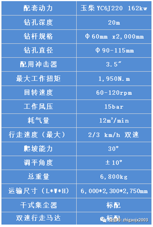 1、該鉆機(jī)配套動(dòng)力為玉柴YC6J220,匹配12/15螺桿空壓機(jī),滿足90-115mm孔徑;