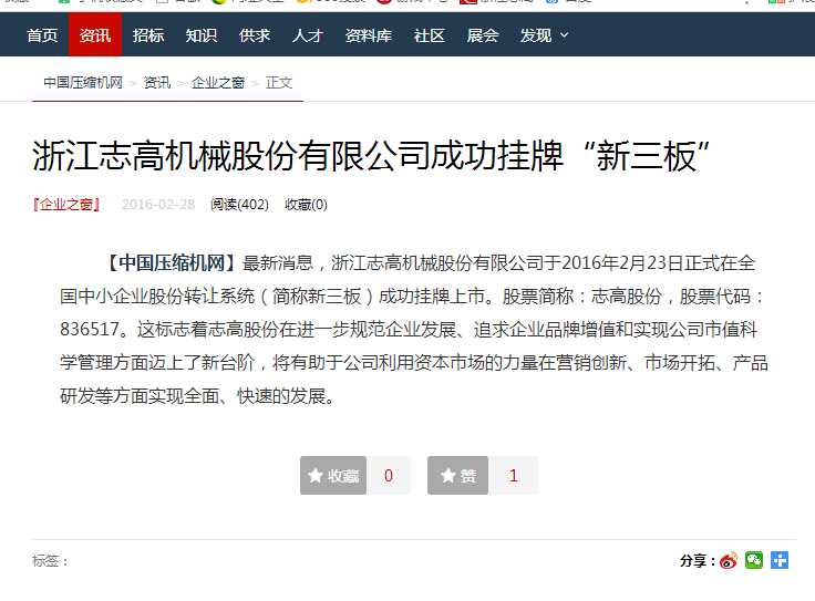 【中國(guó)壓縮機(jī)網(wǎng)】對(duì)浙江志高機(jī)械股份有限公司2016年2月掛牌新三板進(jìn)行了報(bào)道,一下是報(bào)道截圖: